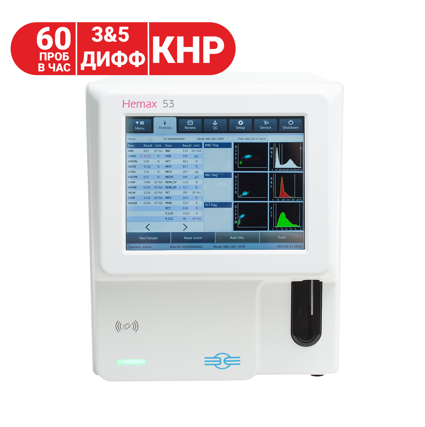 • Возможность выполнения анализа крови как в режиме 5-ДИФФ, так и 3-ДИФФ. Переход на выполнение анализа в режиме 3-ДИФФ обеспечивает значительную экономию на стоимости анализа.