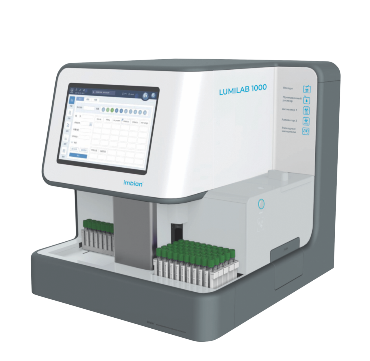 Загрузка расходных материалов организована через интегрированные штативы. Единовременно на борту размещается до 140 реакционных кювет и 140 наконечников с возможностью дозагрузки в процессе работы без остановки исследований. Контроль количества расходных материалов и твердых отходов осуществляется в режиме реального времени с цветовой индикацией на корпусе прибора. Контейнер для твердых отходов рассчитан на 380 кювет и наконечников. Система предусматривает слив жидких отходов в отдельную емкость с возможностью подключения к канализации. Для выполнения 1000 тестов достаточно одной упаковки концентрата промывочного буфера. Для работы используются буфер, активатор и разбавитель серии LUMILAB-ИМБИАН-ИХЛА.